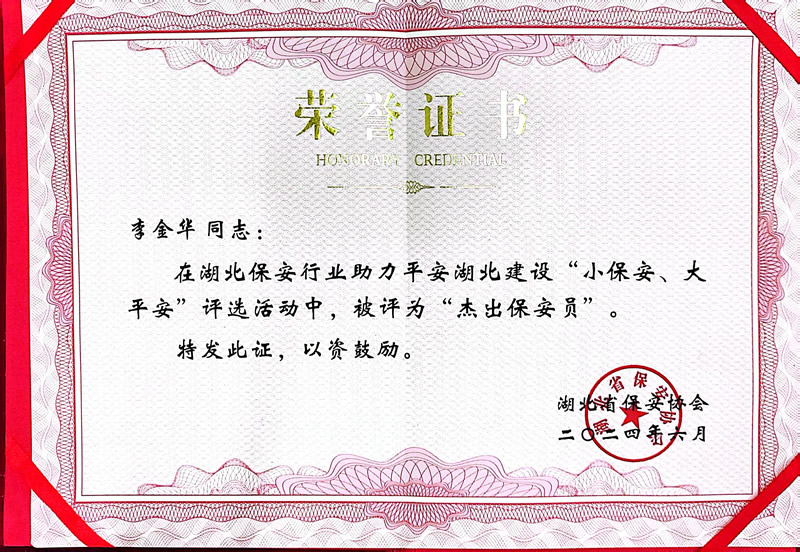 杰出保安員榮譽證書